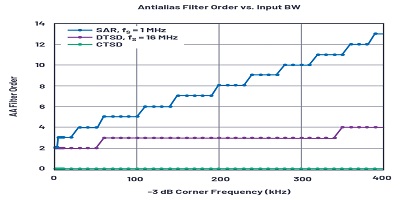 9給出了SAR和離散時間sigma-deltaDTSD)架構(gòu)的AAF復(fù)雜度的想法。如果我們采用100 kHz–3 dB輸入帶寬以在采樣頻率fS處實現(xiàn)102 dB衰減,則DTSD ADC將需要二階抗混疊濾波器,而在fS處獲得相同的衰減將需要使用SAR ADC。