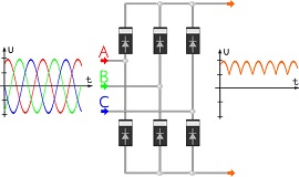 通常,您會(huì)發(fā)現(xiàn)使用晶閘管來(lái)代替二極管來(lái)調(diào)節(jié)電壓輸出。此外,大多數(shù)提供直流電的設(shè)備也會(huì)產(chǎn)生三相交流電。例如包含六個(gè)二極管的汽車交流發(fā)電機(jī),它可以作為全波整流器為汽車電池充電。
