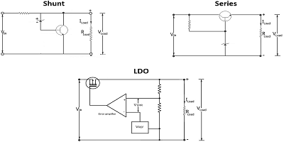 三種常見(jiàn)的線性電壓電路圖:(左)并聯(lián),(中心)系列和(右)LDO