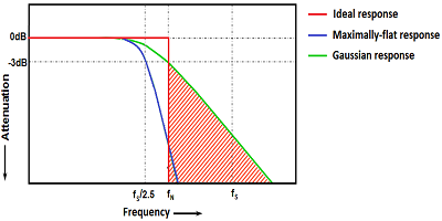 對于紅色曲線,ADC輸入頻率響應(yīng)恰好在奈奎斯特頻率處被截斷。盡管您可以通過正確的過濾器集來接近,但這種理想的行為無法物理再現(xiàn)。大多數(shù)ADC的實際行為對于經(jīng)常使用示波器的人們是熟悉的。響應(yīng)是高斯或類似高斯的。處理PCB中的寬帶信號的一個更好的選擇是選擇一個帶寬接近藍色曲線的ADC。在這里,我們有一個有效奈奎斯特頻率,等于Fs / 2.5。